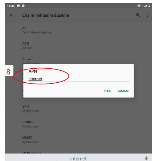 “wap” ı silip “internet” yazıp “tamam” a tıklayalım.meb aidata mobil veri aktif etme 8